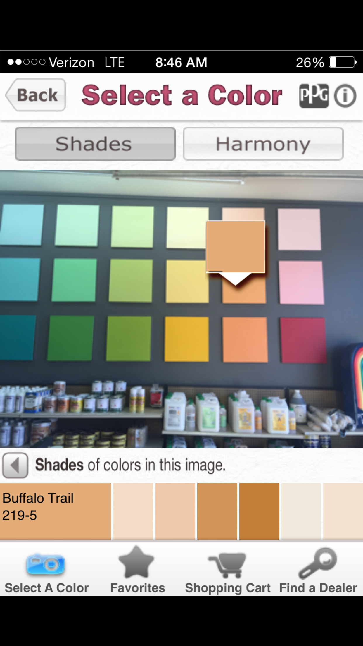 I took the above picture for the app to analyze and draw colors from and the app did very well! It was extremely close at pulling the exact colors we used. The most interesting feature of the app was the ability to click on items in the photo. Most of the time the image is analyze and you are presented with colors from the image, this app allows you to interact with all of the colors in the photo. As you can see from the image I simply clicked one of the colors on our palette wall and immediately I was given shades, names, and the ability to save these colors.